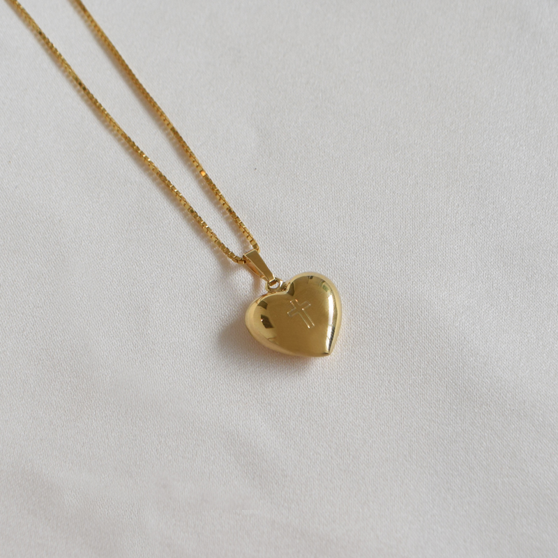 Ett elegant och personligt halsband i 18 karat förgyllt sterlingsilver med hjärthänge och ett vackert ingraverat kors på framsidan. Det mjuka, organiska hjärtat i kombination med det klassiska korset skapar ett feminint och tidlöst smycke med stark symbolik.