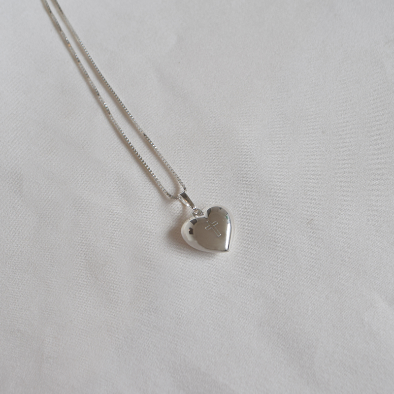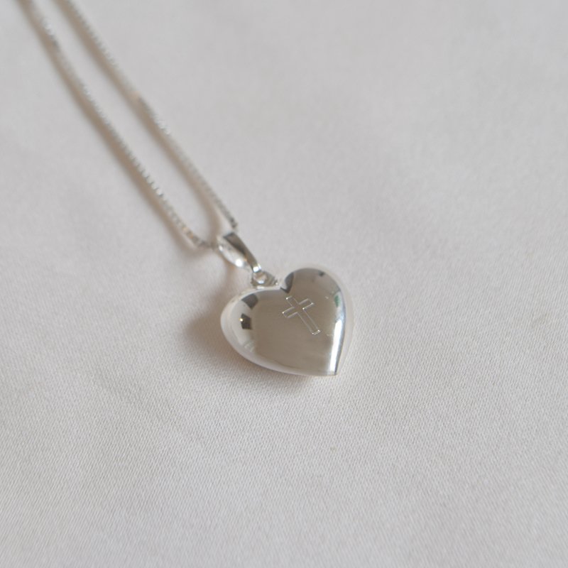 Ett elegant och personligt halsband i sterlingsilver med hjärthänge och ett vackert ingraverat kors på framsidan. Det enkla och rena silveruttrycket framhäver designens fina detaljer och ger ett stilrent och tidlöst intryck.
