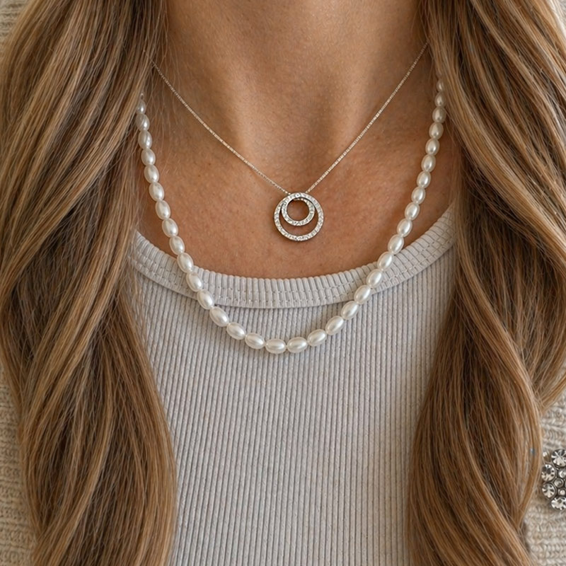 Ett elegant halsband i 925 silver med ett modernt dubbelt cirkelhänge dekorerat med gnistrande zirkonia. Ett tidlöst smycke som passar lika bra till vardag som till fest. Den perfekta presenten till dig själv eller någon du tycker om.